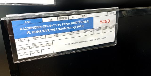 じゃんぱらへ行くと、Acerの21.5インチ液晶モニターが480円で出ていた。