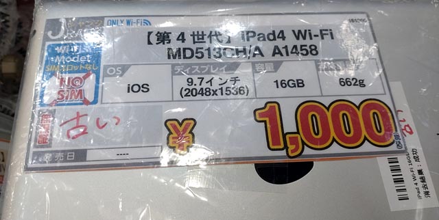 秋月横のイオシスでiPadを漁ると、第4世代が1,000円で転がっていた。
