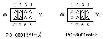 デフォルトではPC-8801シリーズ用の設定になっていますが、PC-8001mk2で使用する場合は、下図の右側のようにジャンパピンを差し替えて使用します。